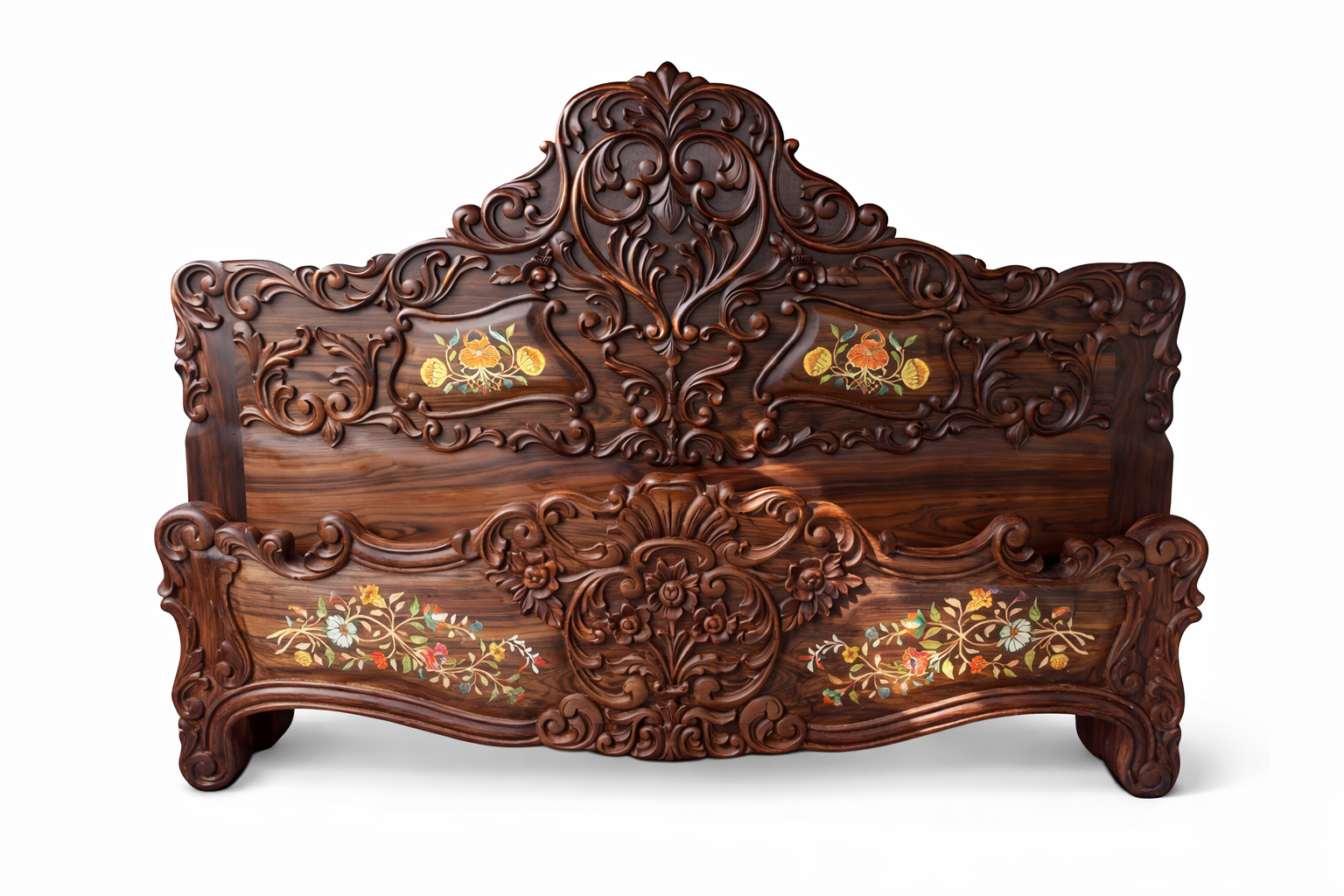 Richly detailed hand-carved headboard with classic scroll and floral motifs
